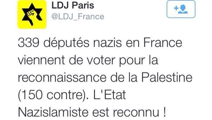 Suite à la reconnaissance symbolique de l’Etat de Palestine par l’Assemblée Nationale mardi dernier, la Ligue de Défense Juive (LDJ) a réagi de façon virulente sur son compte twitter.