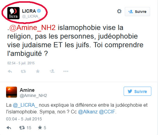 Imposant le Juif comme étant la seule victime d’une haine ethnique et religieuse, la LICRA s’est faite donneuse de leçons sur Twitter.
