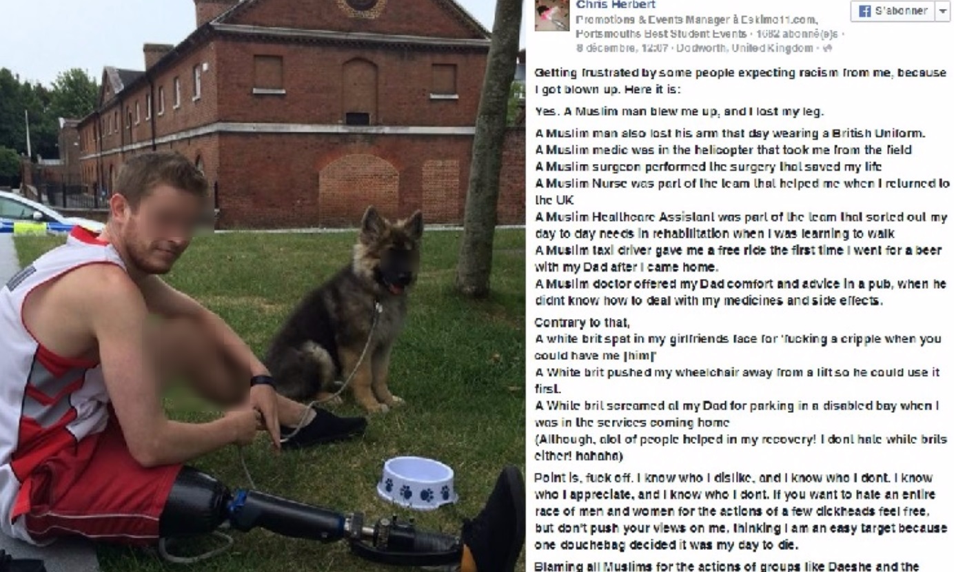 L’invitation a été lancée à un vétéran britannique blessé lors d’un combat mené en Afghanistan ou en Irak et donc grand ennemi supposé des musulmans, mais au lieu de répondre par la positive, celui-ci las des sollicitations haineuses a préféré décocher une flèche empoisonnée sous forme de message posté sur sa page Facebook.