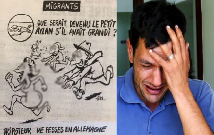 Le dessin de Charlie Hebdo a fait beaucoup de mal au père du petit Aylan, qui a pleuré toutes les larmes de son corps à la vue de l’infect dessin « Que serait devenu le petit Aylan s’il avait grandi ? » Faisant allusion aux derniers événements survenus en Allemagne, le dessinateur Riss l’a dépeint tel un pervers à la poursuite d’une femme avec comme réponse: