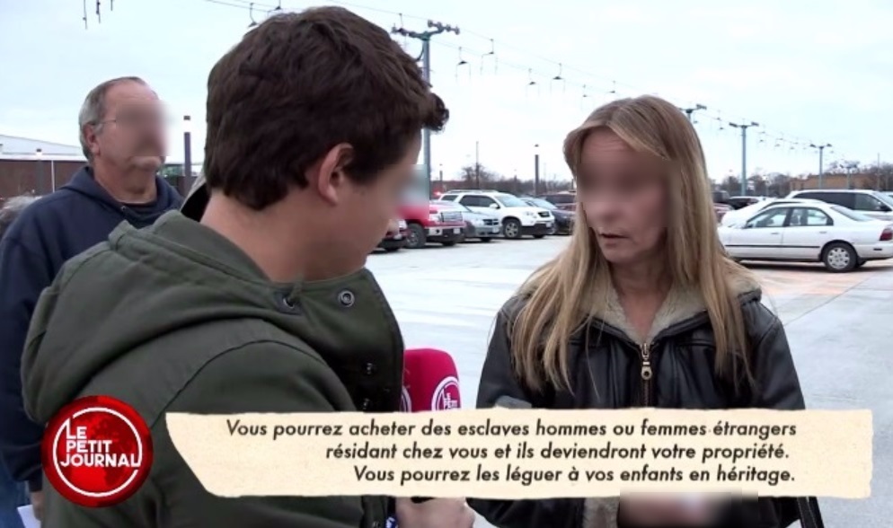 « Je vais vous lire quelques versets du Coran. Dites-moi si vous les trouvez choquants. » Et il cite : « Femmes, soyez soumises à vos maris, comme au Seigneur ». « C’est choquant », lui dit une femme. Imperturbable, le journaliste continue : « Serviteurs, soumettez-vous à votre maître avec tout le respect qui lui est dû, non seulement s’il est bon et bienveillant, mais aussi s’il est dur. » Les partisans conditionnés à haïr le musulman ne se rendent même pas compte qu’il s’agit de leur sacro-sainte Bible et semblent tous irrités par les paroles divines.