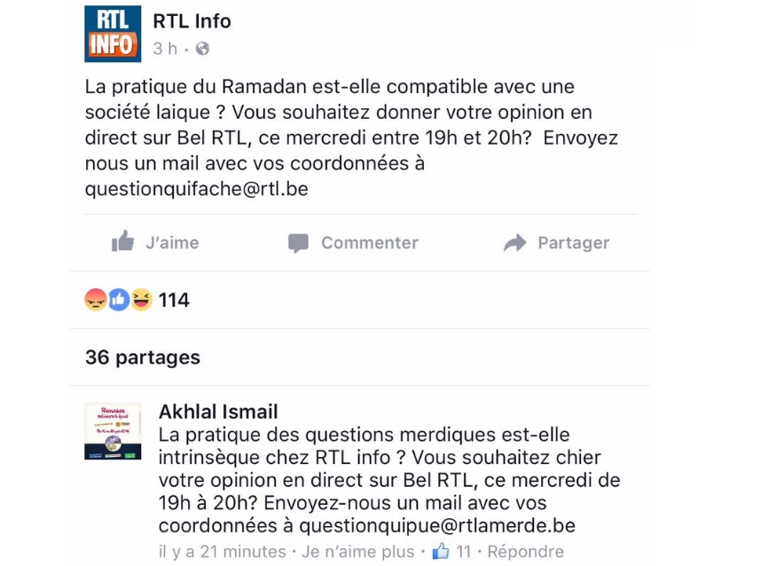 La radio belge Bel RTL a pour habitude de lancer des débats qui ont pour objectif de faire réagir les auditeurs, mais le 8 juin, la radio a fait très fort en soumettant au vote des auditeurs la question suivante : « La pratique du Ramadan est-elle compatible avec une société laïque ? »