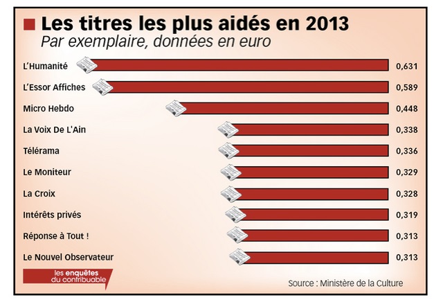 D’après le site Info-contre-Info, près de 2 milliards d’euros seraient reversés chaque année à la presse française, de la part des aides directes (aides à la diffusion, au pluralisme, à la modernisation)dont le montant s’élève à 373 millions d’euros en 2013 (dont 120 millions pour les abonnements de l’État à l’AFP).