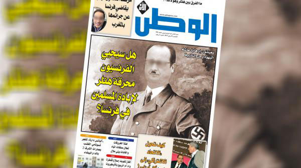 A la Une du Magazine Al Watan Al Ane, François Hollande a été caricaturé en Nazi, et plus particulièrement à leur leader Adolf Hitler. Ce photomontage a été diffusé en première page avec pour titre : « Les Français vont-ils faire renaître les camps de concentration d’Hitler pour exterminer les musulmans ? »