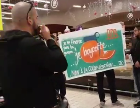 Des sympathisants de la cause Palestinienne se sont retrouvés dans un hypermarché E.Leclerc pour dénoncer le produit Jafaden, labellisé sous la marque “repère”, un jus fruit en provenance d’Israël et produit à partir d’oranges cueillies sur les terres volées aux Palestiniens.