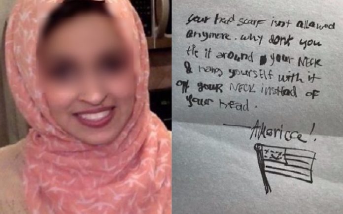 « Votre foulard n’est plus toléré dorénavant. Pourquoi n’attachez-vous pas votre voile autour de votre cou, au lieu de le mettre sur la tête, et ne vous pendez-vous pas avec ? », a-t-elle lu stupéfaite, le message était signé « l’Amérique » accompagné de la bannière étoilée.