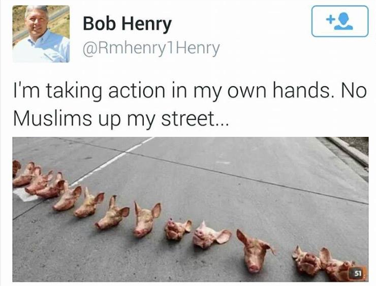 Le talentueux Bob Henry a trouvé la parade pour contrer la vague islamiste qui a pris possession de sa petite ville. Il a disposé plusieurs têtes de cochons sur toute la largeur de la chaussée dans le but d’éloigner tout “méchant musulman” qui aurait la mauvaise idée de traverser la rue. Une sorte de frontière anti-Musulmans.