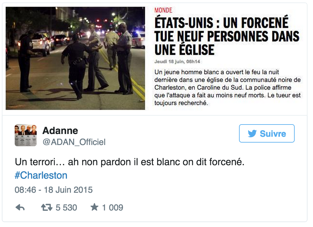 A chaque événement dramatique nous pouvons en faire le triste constat, comme le dernier en date, la fusillade de Charleston qui s’est conclue par la mort de 9 personnes, où l’auteur présumé Dylann Roof, un jeune blanc de 21 ans est présenté comme un forcené par la majorité des médias.