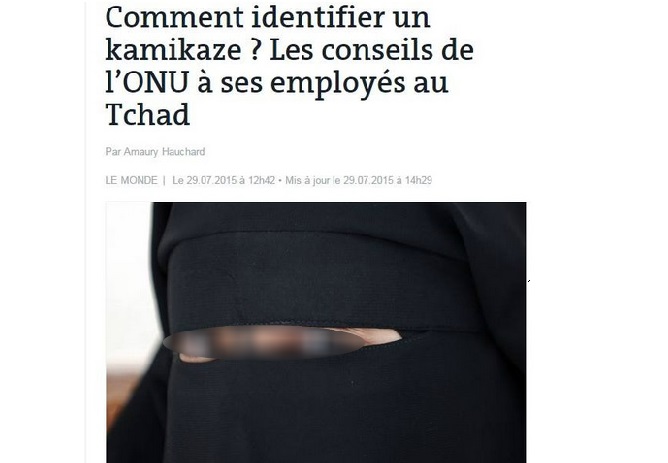 L’endoctrinement médiatique dont nous sommes tous victimes est loin d’être anodin et cache une cause beaucoup plus vicieuse qu’il n’y paraît. Car cette désinformation n’a pour seul but que d’alimenter la haine à l’égard de l’Islam et des musulmans. Comment pourrait-il en être autrement ? Lorsque le quotidien Le Monde, dans son édition du 29 juillet publie son article intitulé «Comment identifier un kamikaze ? Les conseils de l’ONU à ses employés au Tchad» avec en illustration une femme en niqab.