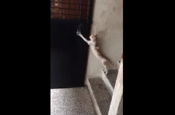 Dans la vidéo suivante, un chat demande la permission d’entrer en tapant plusieurs fois sur le verrou de la porte d’entrée.