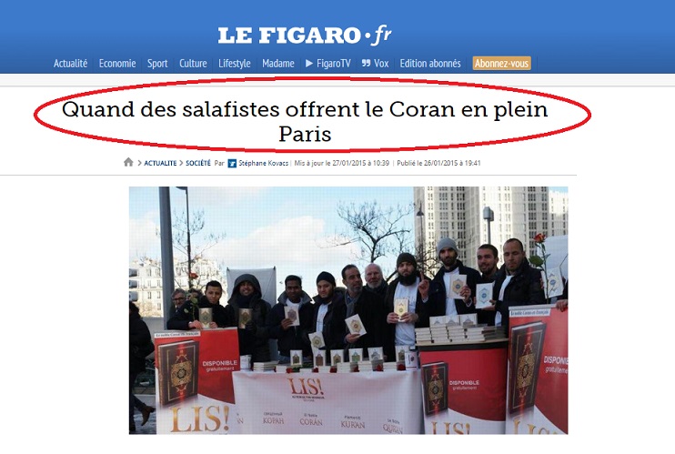 Bien que la préfecture de police de Paris assure qu’« il n’y avait pas de raison d’empêcher cette distribution sur la voie publique, vu que cette association l’a déjà fait plusieurs fois et qu’il n’y a jamais eu de problèmes », Le Figaro a jugé bon de qualifier cette association de « groupe d’extrémistes salafistes », se basant sur un article de presse allemande datant de 2012…