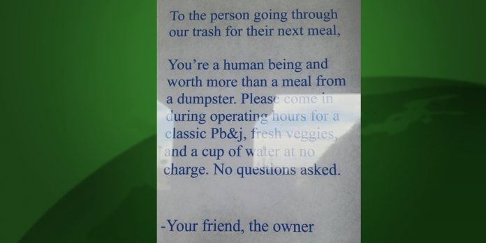 « A la personne qui fouille nos poubelles pour manger. Vous êtes un être humain et méritez plus que les restes d’une benne à ordures. S’il vous plaît, venez pendant les ouvertures pour un sandwich classique, des légumes frais et un verre d’eau, gratuits. On ne vous posera pas de questions ». Signé « Votre ami, le propriétaire »