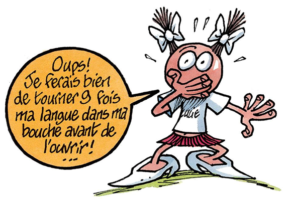 En effet, on peut y voir “La Petite Lucie” en train de dire « Oups ! Je ferais bien de tourner 9 fois ma langue dans ma bouche avant de l’ouvrir !… » avec un texte d’excuse qui accompagne le dessin: