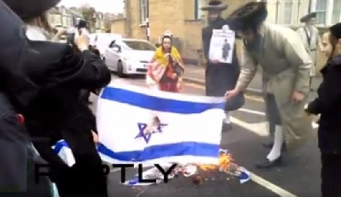 Dans la vidéo suivante, à l’occasion de la fête juive Pourim, des juifs orthodoxes de Naturi Karta brûlent plusieurs drapeaux israéliens en plein cœur de Londres.