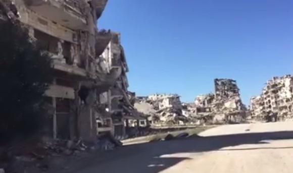 Ville martyre de la révolution syrienne, elle fut détruite après cinq ans de guerre par les forces militaires pro-Assad. Les rebelles contraints de fuir au nord de la Syrie. La ville qui comptait autrefois près d’un million d’habitants de majorité sunnites est devenue un champ de ruine.