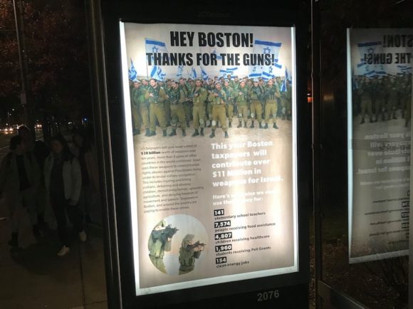 Après que la ville de Boston a interdit les campagnes publicitaires en faveur de la Palestine, un groupe de militants répand des affiches dénonçant l’aide militaire de Boston à l’armée israélienne. À Boston, vous pouvez admirer une affiche apposée sur tous les abris bus.