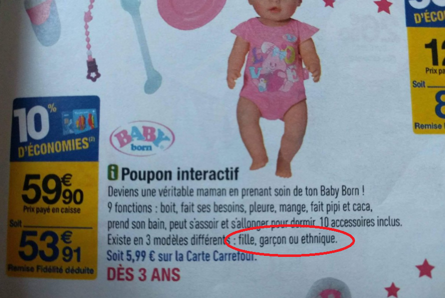 « Deviens une véritable maman en prenant soin de ton “BabyBorn” », un message destinée à toutes les gentilles petites filles qui pourront choisir leur poupée de rêve blanche fille ou garçon ou «ethnique», noire.