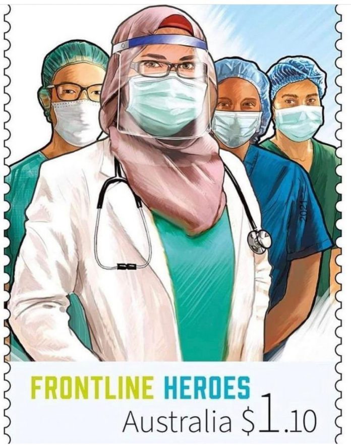 Dans une de ces séries de timbres, l’Australie met à l’honneur une femme médecin portant le hijab et sa blouse médicale. Les timbres sont vendus sur le site un internet de l’Australia Post.