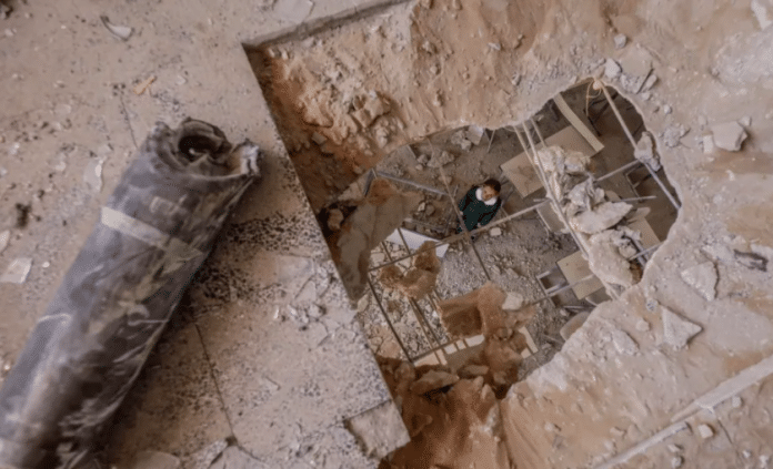 La photo gagnante montre une étudiante palestinienne regardant à travers un trou dans le plafond de sa classe avec un missile sur le côté du trou. Elle a été prise au lendemain de l’assaut israélien contre Gaza en mai 2021 et met en évidence la barbarie de l’occupation.