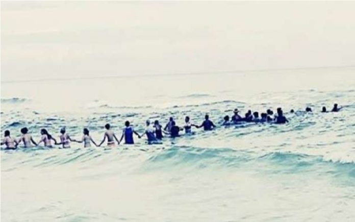 Elle rejoint le groupe en difficulté pendant que son mari aidé de plusieurs vacanciers forment une chaîne humaine dans l’eau.