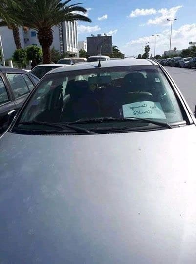 Il faut croire que cet automobiliste n’était pas à son premier coup d’essai. Précautionneux, l’homme a pris le temps d’imprimer une affiche indiquant « A la mosquée pour la prière » et l’a déposé en évidence sur son pare-brise, pour qui le chercherait…
