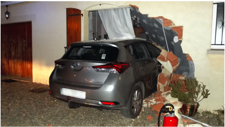 Que s’est-il passé ? Le conducteur a-t-il eu un malaise au volant ou une absence ? Toujours est-il que le couple de personnes âgées s’est retrouvé soudain en voiture à l’intérieur de leur chambre à coucher. Sous la violence du choc, une fenêtre a volé en éclat, et une partie de la façade s’est effondrée.