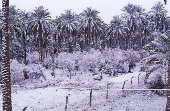 La dernière chute de neige enregistrée dans la ville remonte à 2008, avant laquelle Bagdad n’avait pas vu de neige depuis plus d’un siècle. Les palmiers de la ville étaient saupoudrés de blanc ce matin, et la place Tahrir.