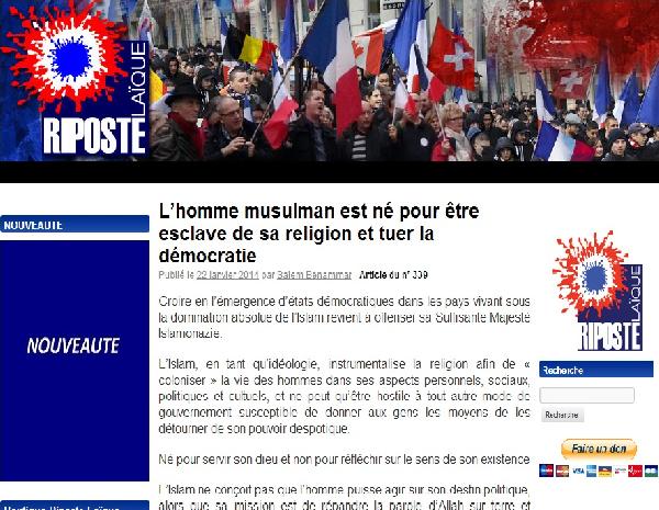«L’homme musulman est né pour être esclave de sa religion et tuer la démocratie.» Il s’agit du titre polémique du site islamophobe Riposte Laïque qui ose faire un parallélisme scandaleux entre le nazisme et l’Islam.