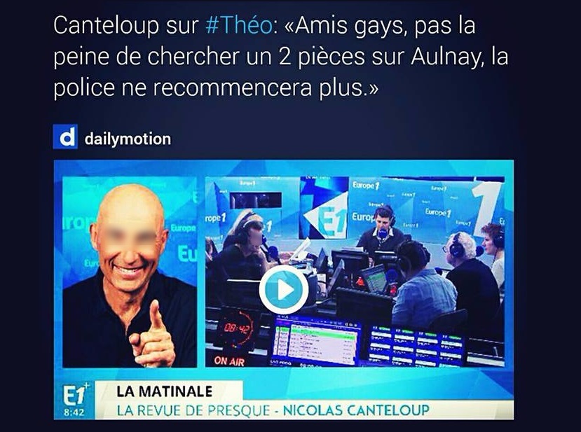 Suite au viol du jeune Théo à Aulnay-sous-bois par quatre policiers à l’aide d’une matraque télescopique lors d’une interpellation violente et musclée, l’humoriste de TF1 Nicolas Cantaloup a tenté une phrase humoristique mais très déplacée au regard du traumatisme de la victime et de ses proches.