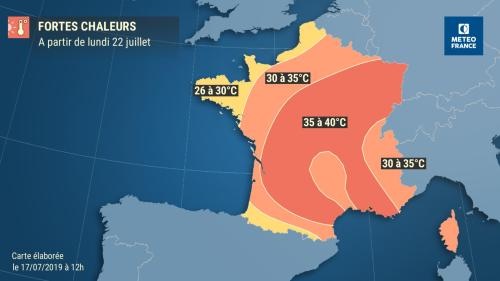 En début de semaine prochaine, les températures atteindront entre 30 et 35 °C sur la moitié nord et entre 35 et 39 °C, localement 40 °C du Sud-Ouest au Centre-Est et du Languedoc à la Provence. La durée de cet épisode et son étendue géographique restent à surveiller à cette échéance