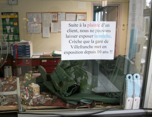 Ainsi la crèche est couverte d’une bâche avec l’affiche suivante scotchée sur la vitre : « Suite à la plainte d’un client, nous ne pouvons laisser exposer la crèche. Crèche que la gare de Villefranche met en exposition depuis dix ans !! ».