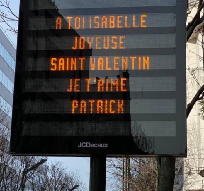 Ce dimanche 14 février, à l’occasion de la Saint-Valentin, Patrick Balkany a tenu à témoigner de son amour pour son épouse Isabelle. L’ancien maire de Levallois-Perret dans lesHauts-de-Seine a fait diffuser un petit message personnel grâce aux panneaux d’affichage de la ville.