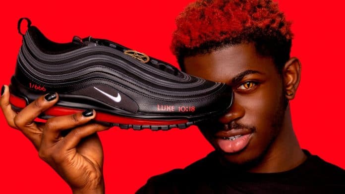 Les baskets noires et rouges, qui font partie d’une collaboration entre Lil Nas X et le collectif d’art new-yorkais MSCHF, ont été fabriquées avec des Nike Air Max 97, bien que la marque de vêtements de sport se soit distancée du design.
