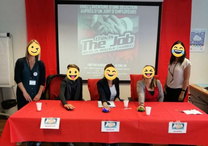Le candidat, demandeur d’emploi, se retrouve seul face à des chaises retournées et passe un entretien« à l’aveugle. »