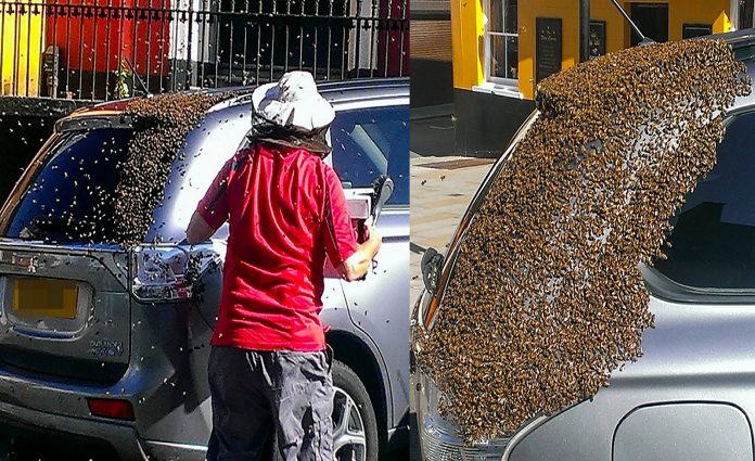 Tout commence à Hoverfordwest, au Pays-de-Galles, Carol Howarth gare sa voiture dans le centre-ville et après avoir vaqué à ses occupations qu’elle n’est pas sa surprise de voir agglutiner des milliers d’abeilles au coffre du véhicule, 20.000 abeilles au total !