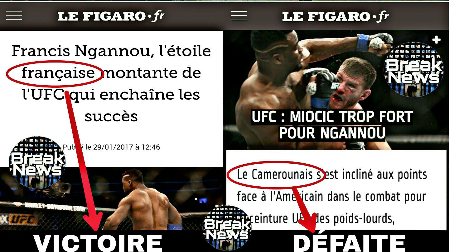 Dernier cas de figure avec le combattant de MMA Francis Naganou qui avait été titré « étoile française montante » par le Figaro au lendemain de sa victoire et devient à la suite de sa défaite « Le Camerounais s’est incliné face à l’Américain… »