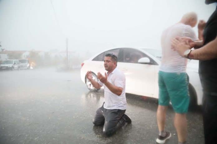 Alors que les pluies aidaient à éteindre les feux de forêt, certaines personnes à Manavgat se sont agenouillées et ont commencé à prier, remerciant Dieu pour les précipitations sur les routes principales. Les pluies, qui ont duré 20 minutes, ont aidé à éteindre l’incendie de forêt dans le quartier Ormana d’İbradı et le quartier Kalemler de Manavgat.