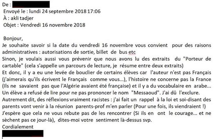 L’auteur du livre , a posté sur sa page Facebook le mail reçu de la dite professeure.