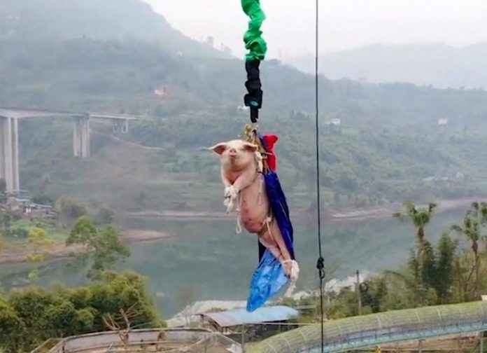 Un parc à thème chinois a déclenché une vague d’indignation sur les réseaux sociaux après avoir forcé un cochon à sauter à l’élastique d’une tour de 68 mètres de haut.