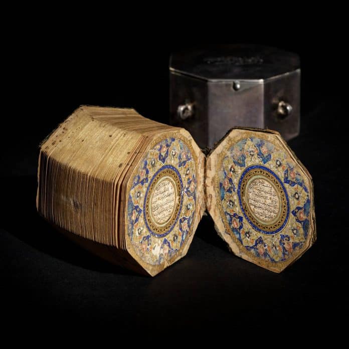Voici un manuscrit du Coran de 4,2 x 4 cm de forme octogonale. Rangé dans sa petite boîte en métal, il était attaché à la ceinture, pour être notamment porté sur le champ de bataille. Les pirates et corsaires en avaient de similaires. Celui-ci a été réalisé en 963H (1555G) par ʿAlī al-Qārī à Herat, en Afghanistan.