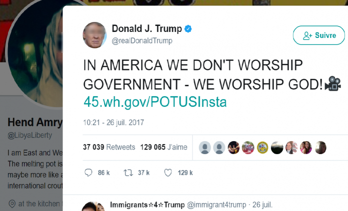 Faisant fit de son serment de respecter la Constitution, il exprime sa préférence religieuse sous les yeux de millions de personnes. Cette attitude a révolté Hend Army, écrivaine et artiste américano-libyenne qui a répondu au tweet de Trump par: « Pourrais-je avoir un “ALLAHU AKBAR”. »