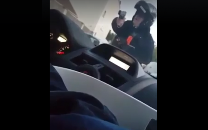 Le policier se montre menaçant en affirmant sa supériorité face à un jeune homme qui n’a rien d’agressif et qui ne représente aucun danger apparent.