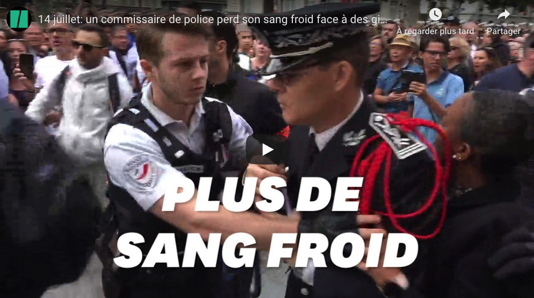 Durant le défilé du 14 juillet ce dimanche à Paris, un commissaire de police a perdu son sang froid et en est venu aux mains avec une foule de gilets jaunes sur les Champs-Élysées.