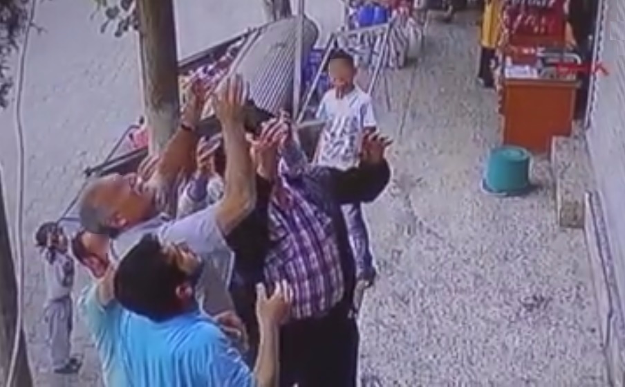 Cette scène captée par une caméra de surveillance se passe en Turquie. Plusieurs personnes regardent en l’air et s’attendent au pire. Certains lèvent les bras dans le but évident d’amortir la chute imminente d’une personne. S’agit-il de quelqu’un qui tente de se suicider ?