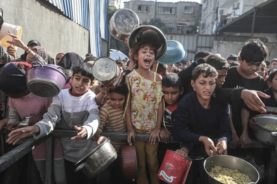 Des Palestiniens déplacés attendent de recevoir un repas chaud distribué par une organisation caritative dans le camp de Nuseirat, à Gaza, le 22 novembre 2025.