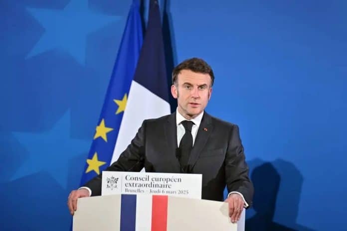 Le président français Emmanuel Macron prononce un discours à Bruxelles, en Belgique, le 6 mars 2025.