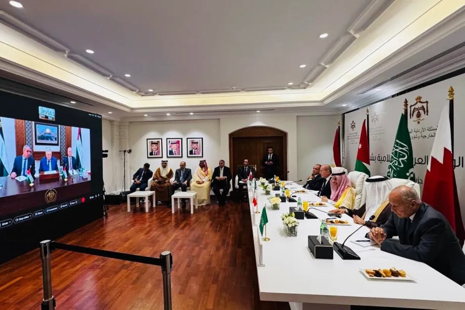 Le ministre égyptien des Affaires étrangères Badr Abdelatty, le ministre saoudien des Affaires étrangères le prince Faisal ben Farhan, le ministre jordanien des Affaires étrangères Ayman Safadi, le ministre bahreïni des Affaires étrangères Abdullatif ben Rachid Al Zayani et le secrétaire général de la Ligue arabe Ahmed Aboul Gheit posent pour une photo de groupe après avoir publié une déclaration conjointe condamnant la décision d’Israël de bloquer leur visite diplomatique prévue à Ramallah, lors d’une réunion tenue à Amman, en Jordanie, le 1er juin 2025.