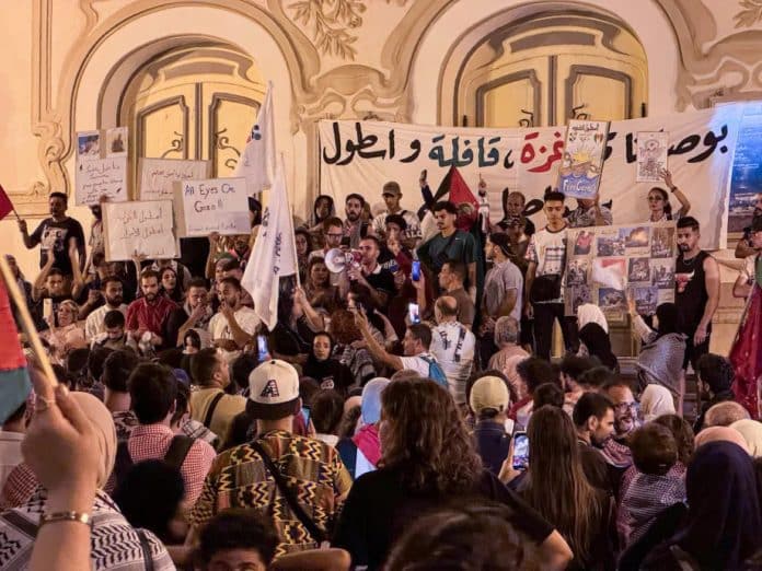 Selon des sources bien informées, trois drones ont survolé le navire Omar Al-Mukhtar , qui naviguait seul pour rejoindre la flottille, suscitant de sérieuses inquiétudes parmi son équipage.