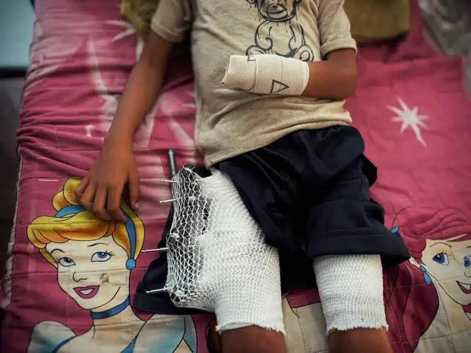 Asad al-Maidana repose sur un lit avec les jambes bandées et une main amputée visible à al-Sawarha, Gaza, le 10 septembre 2025.