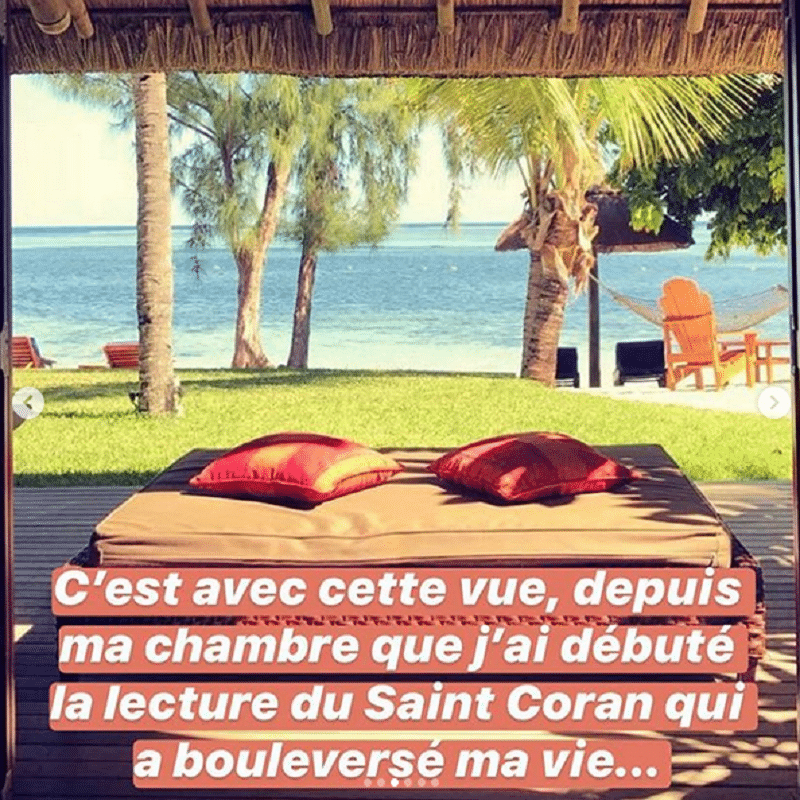 «C’est avec cette vue, depuis ma chambre que j’ai débuté la lecture du Saint Coran qui a bouleversé ma vie. La nuit tombée je lisais, seule sur la plage, éclairée par la lune. Parfois, je ne rentrais même plus dans ma chambre. J’avais besoin de me sentir proche de la création, la foi au Dieu unique gagnait mon cœur. J’allais me convertir à l’Islam, je le ressentais au plus profond de moi.»